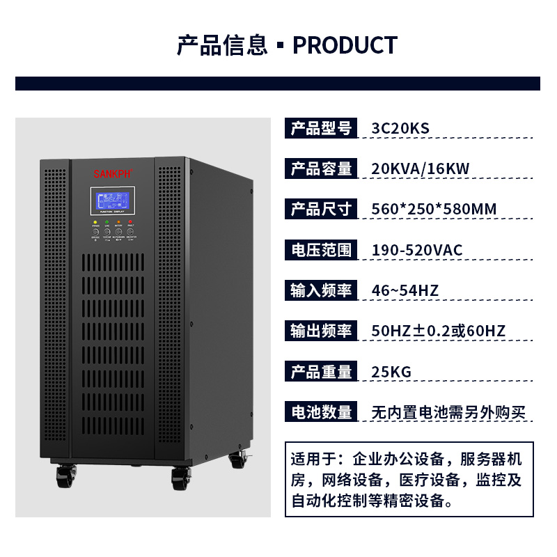 為本機(jī)配置的電池為:SANKPH 12V100AH,本電池專為UPS電源研發(fā)的專用電池,兼容性更優(yōu)。電池產(chǎn)品特性為: