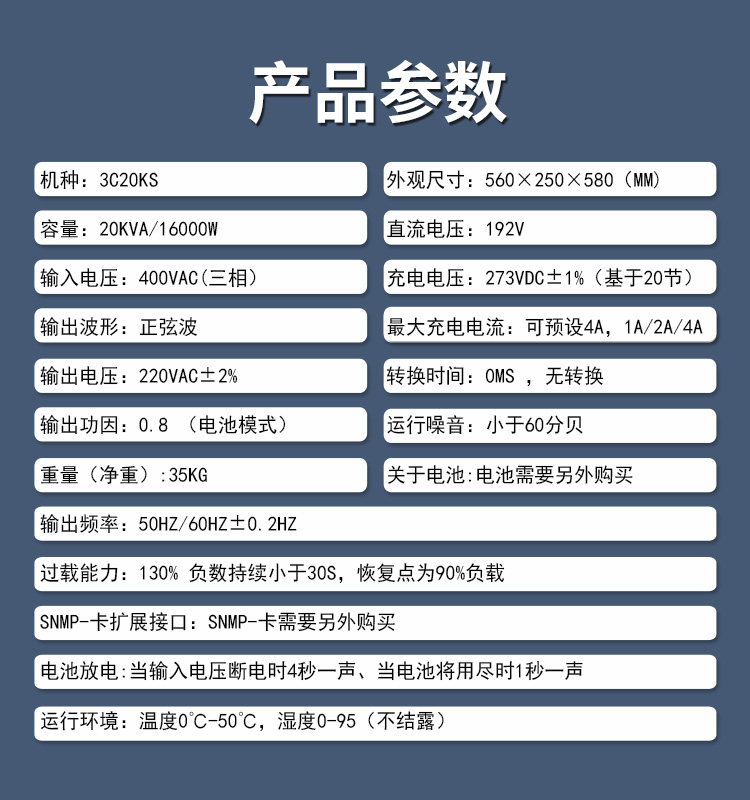 【型 號】SP31-20KS 20KVA/16KW UPS電源 在線式 三進單出 輸入市電380v,輸出設(shè)備220v(可定制輸入輸出220v)