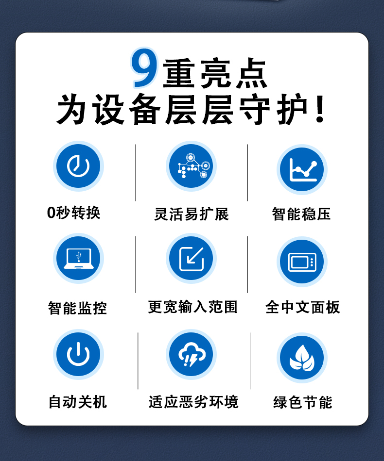 4.靈活配置,因需而變、豐富的擴展功能,滿足客戶的高要求,可實現(xiàn)擴容和并聯(lián)冗余功能,為用戶提供安全可靠的電源彈性及保障