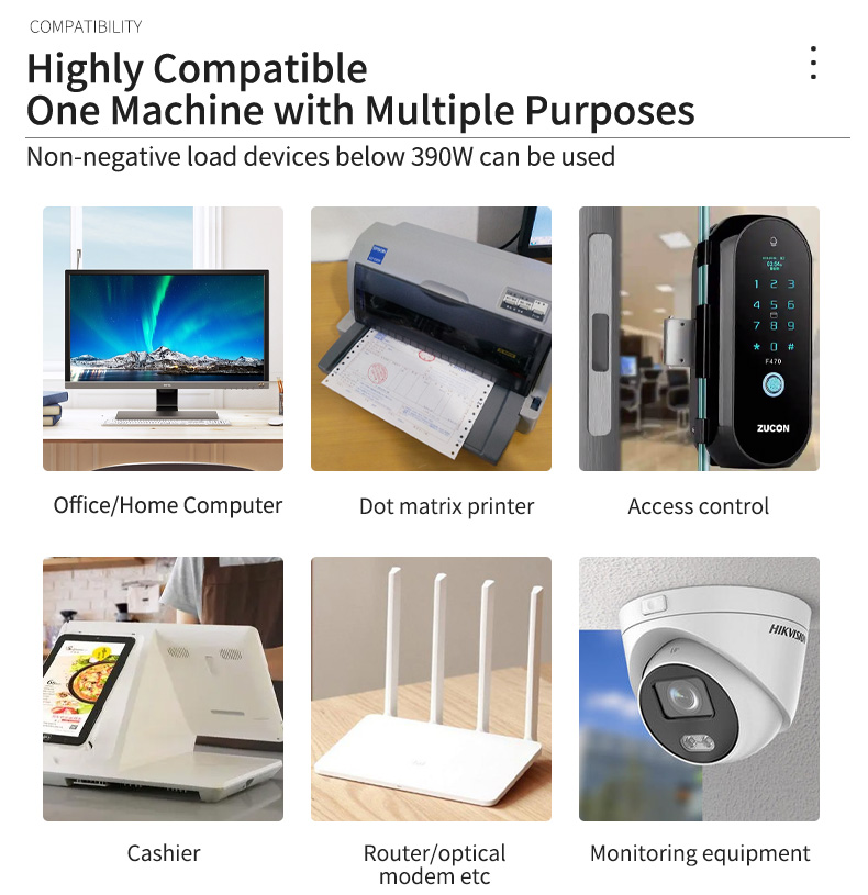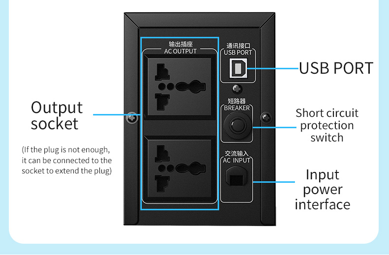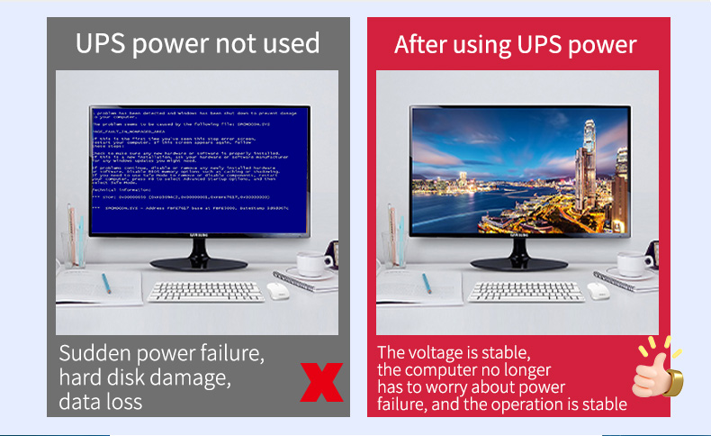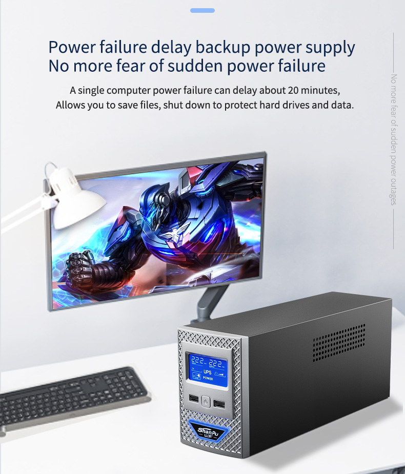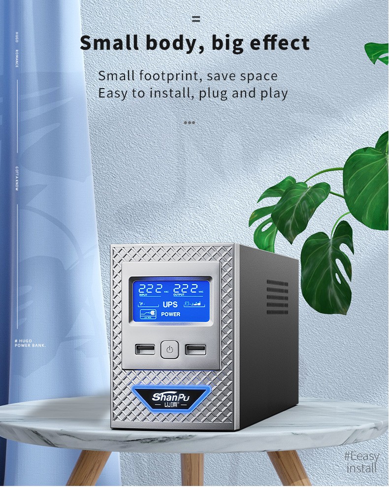 BRAND:MODEL: SP1000 power 1KVA600W built-in 12V9AH lead-acid maintenance-free battery one year, the rest three years. DC VOLTAGE DC 24V input voltage 140-280VAC (wide voltage range) output voltage 210-230VAC (high precision voltage) SHANPU SP1000 backup uninterruptible power supply are designed and manufactured with international technology, it has the advantages of high efficiency, beautiful appearance, advanced and reliable performance and so on. The microcomputer digitally controlled uninterrupted 220-volt AC power supply system is a high quality electronic product specially designed for users of computer systems and precision electronic instruments. In addition to ensuring a stable AC output, it can also be used to generate electricity immediately in the event of a sudden power failure in the AC market or when the instantaneous voltage is too high or too low to continue to supply the load, the transient high-voltage spikes and high-frequency noise signals on the power line are effectively suppressed and purified to the lowest level, so that the stored data and software programs in the computer system are not affected, to ensure the normal operation of computer systems and precision electronic instruments. Product features: SANKPH MT1000 UPS has super voltage-stabilizing function, suitable for people in areas with unstable voltage. Using Motorola CPU control; higher precision; input three-stage voltage-stabilized range 140-280VAC; 9AH Battery 1 Section; Standby Time 15 minutes (single PC) ; switching time ≤8ms; overload, overload, short circuit, shutdown automatic charging; temperature 0 °c-40 °c; Led and sound and light alarm. Product features: perfect and elegant design, adapt to a variety of high-end office areas improve the battery over-discharge protection function, so that users have no worries intelligent automatic sound and light warning function, so that users can safely and efficiently use the advanced automatic constant voltage, constant current charging function, can extend the battery life automatic frequency regulation, automatic short-circuit protection, output overload automatic protection using the United States high-standard UPS electronic integrated circuits and application of microcomputer control technology, when the city power outage directly start UPS, convenient for users to use the city power input high and low voltage automatic protection, while providing continuous stable power supply for users load using the original high-quality maintenance-free valve Lead acid battery, the electric power is durable and stable, and the operation reliability of UPS is improved effectively. Unattended function, battery under-voltage automatic shut-down protection, power back to normal automatic start.
