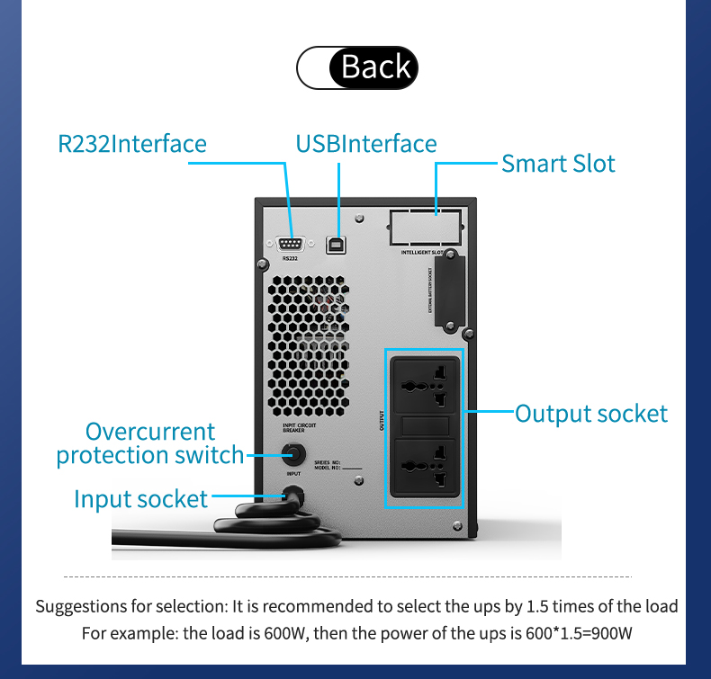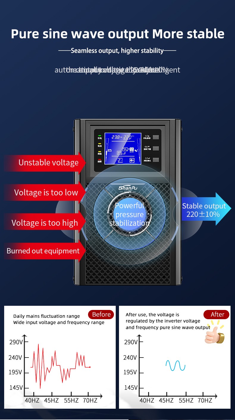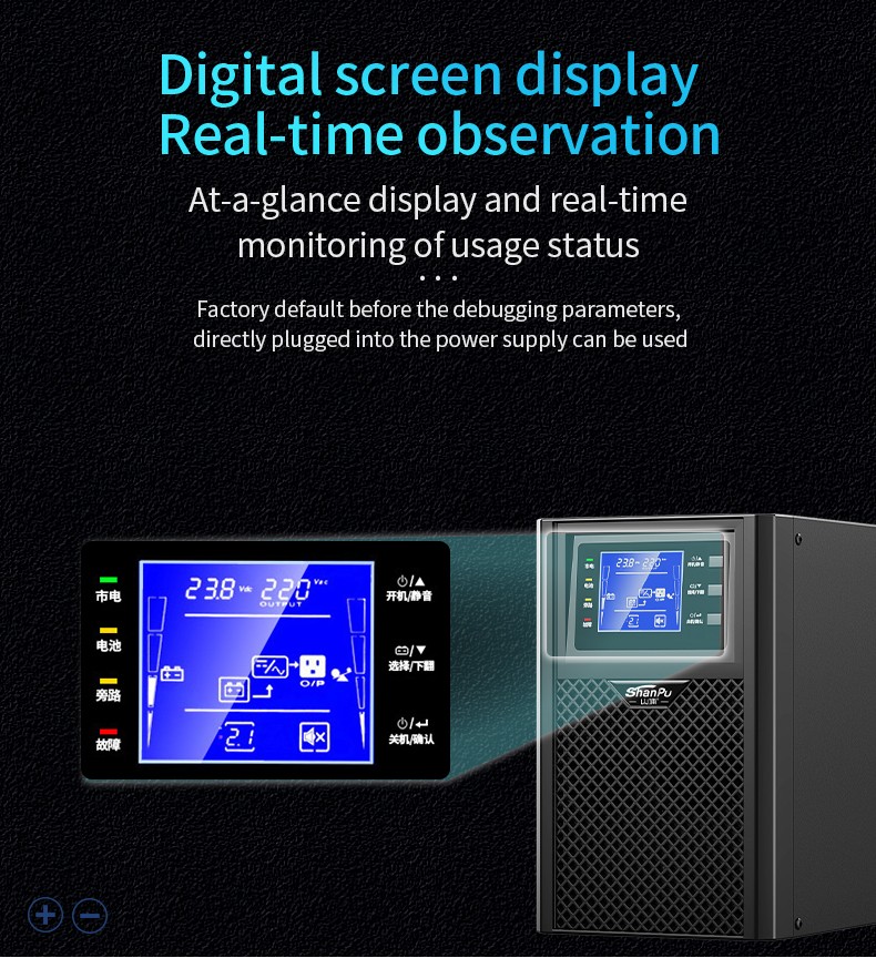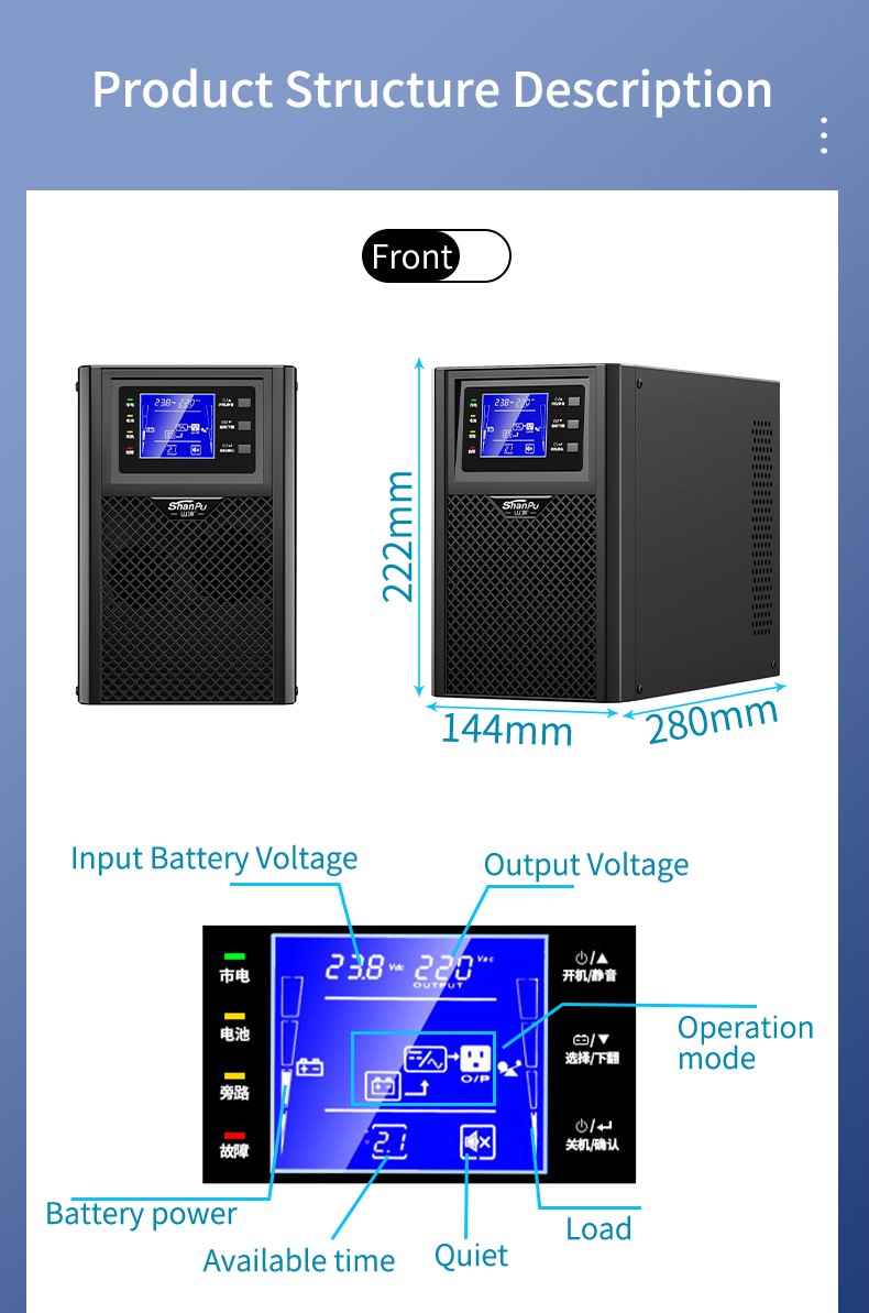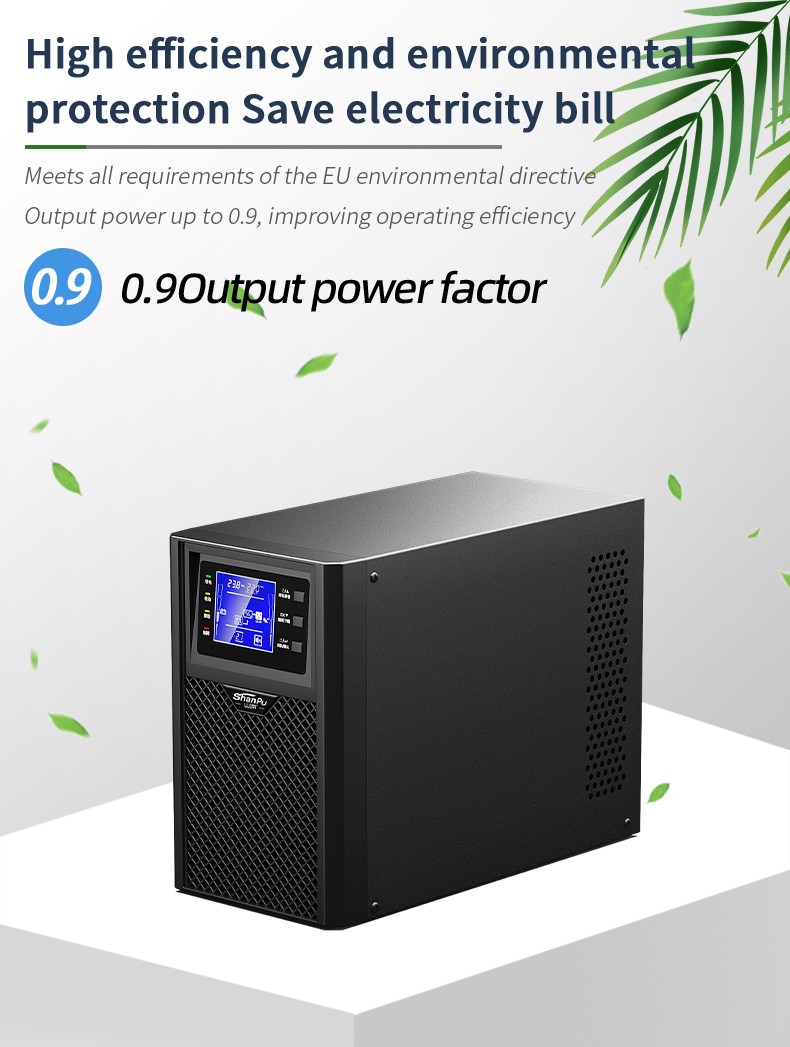 3. Adapt to all kinds of power grid ring, output power factor 0.8, adapt to the development trend of load, realize stronger carrying capacity, the whole machine efficiency is up to 90%, reduce the power consumption of UPS, save the cost of customers.