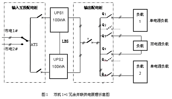 為了容易分析,在這里只用兩臺(tái)UPS作1+1冗余并機(jī),如圖1所示。后面的所有負(fù)載之和小于100kVA,兩臺(tái)UPS的輸出電壓在輸出配電柜內(nèi)直接并機(jī),然后再通過(guò)開關(guān)Q給負(fù)載供電。如果遇到雙電源負(fù)載就可以分別從輸出配電柜上各引一路到負(fù)載,同時(shí)滿足雙電源輸入的條件,如圖中S3、S4所示。
