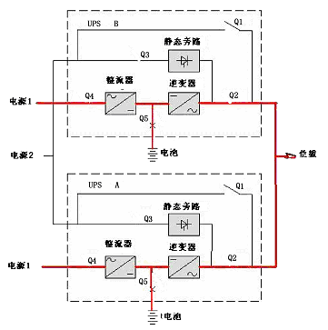 負(fù)載由UPS A和UPS B的整流器--逆變器來(lái)供電,同時(shí)向各自的電池組充電,每臺(tái)UPS的逆變器各帶50%的負(fù)載運(yùn)行。