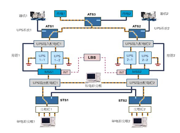 為了消除可能出現(xiàn)在UPS并機系統(tǒng)輸出端與用戶端之間的“單點瓶頸”故障隱患,有必要配置雙總線模塊化(N+X)UPS的輸出配電系統(tǒng)。其基本配置是由“N+1”型模塊化UPS冗余供電系統(tǒng)(優(yōu)選“1+1”或“2+1”型并機供電方案)+輸出配電柜+負載自動切換開關(guān)(LTS)所組成的UPS輸出供電系統(tǒng)。對于某些要求極高的場所,還應(yīng)配置由負載同步控制器(LBS)+兩套“N+1”型模塊化(N+X)UPS冗余供電系統(tǒng)所組成的具有極高“容錯”功能的供電系統(tǒng)。鑒于目前在IDC機房中所用的服務(wù)器和磁盤陣列機等產(chǎn)品中有(30~50)%為采用“雙電源輸入供電”體制的產(chǎn)品,對于這些設(shè)備,可以直接將分別來自兩套“N+1”型并機系統(tǒng)的電源連接到這種“雙電源輸入設(shè)備”的兩個輸入端上。對于采用“單電源輸入供電”方式的關(guān)鍵負載,則是將分別來自兩套“N+1”型并機系統(tǒng)的電源首先連接到“負載自動切換開關(guān)”(常見的是STS型的靜態(tài)開關(guān)和SS型的快速切換開關(guān))的兩個輸入端上,然后再將用戶的關(guān)鍵設(shè)備連接到“負載自動切換開關(guān)”的輸出端上。