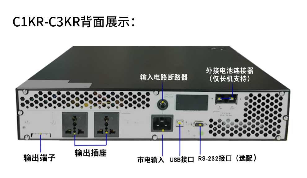 【型 號(hào)】 C1KR(S) 1KVA/800W ;:內(nèi)置2個(gè)電池*12V9AH