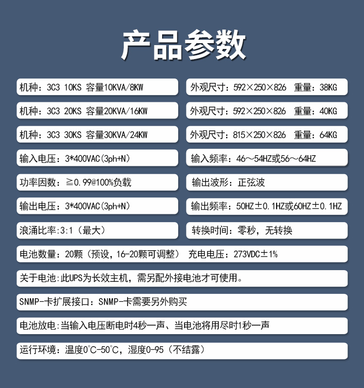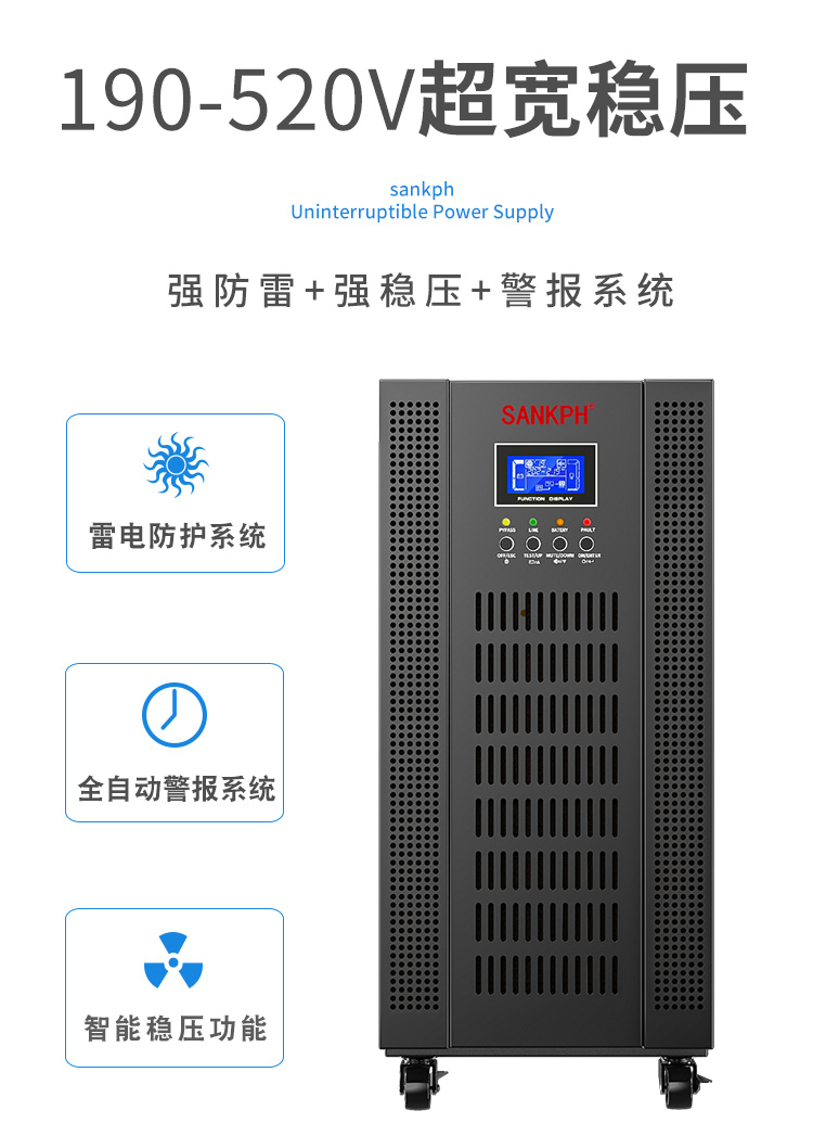 3.豐富的通訊和監(jiān)控:控制面板一目了然,能將UPS運轉(zhuǎn)狀況,負(fù)載情況,電池供電狀況等清晰顯示,隨時掌握UPS運行參數(shù)。4.寬輸入電壓:輸入范圍更多 寬廣110-300VAC